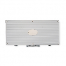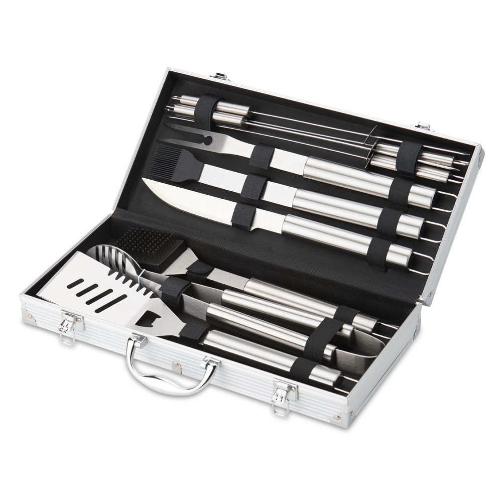 Descrição: Kit de churrasco com três peças em aço inox. O conjunto inclui uma pinça, um garfo e uma faca de seis polegadas. Acompanha maleta de alumínio com placa para personalização.
