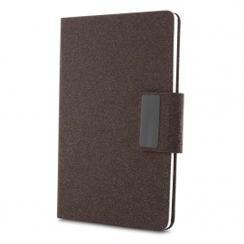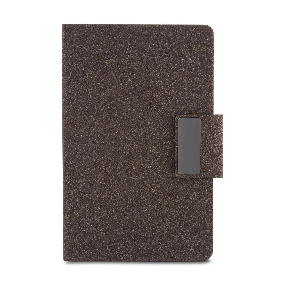 Descrição: Kit executivo com dois itens. O conjunto é composto por uma caderneta com capa dura em couro sintético revestido com fibra de café, no tamanho A5, com fechamento magnético, marca-páginas em fita de cetim e cerca de 80 folhas pautadas; e uma caneta metálica com detalhes do mesmo material, acionamento por rotação e carga esferográfica azul de 1,0 mm. Acompanha uma caixa de papelão com berço em espuma para a caneta.